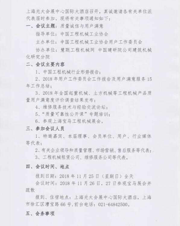 中國工程機(jī)械工業(yè)協(xié)會(huì)用戶工作委員會(huì)關(guān)于召開2018年年會(huì)暨質(zhì)量可靠性公開課的通知